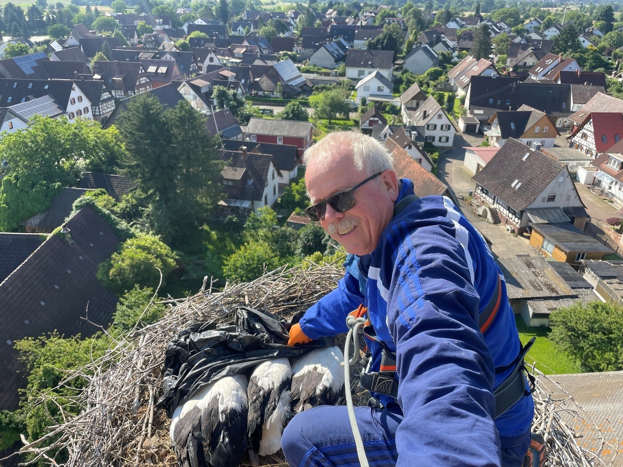 Martin Kury vom Verein Weißstorch Breisgau e.V. beringt die Störche der Gemeinde Vörstetten