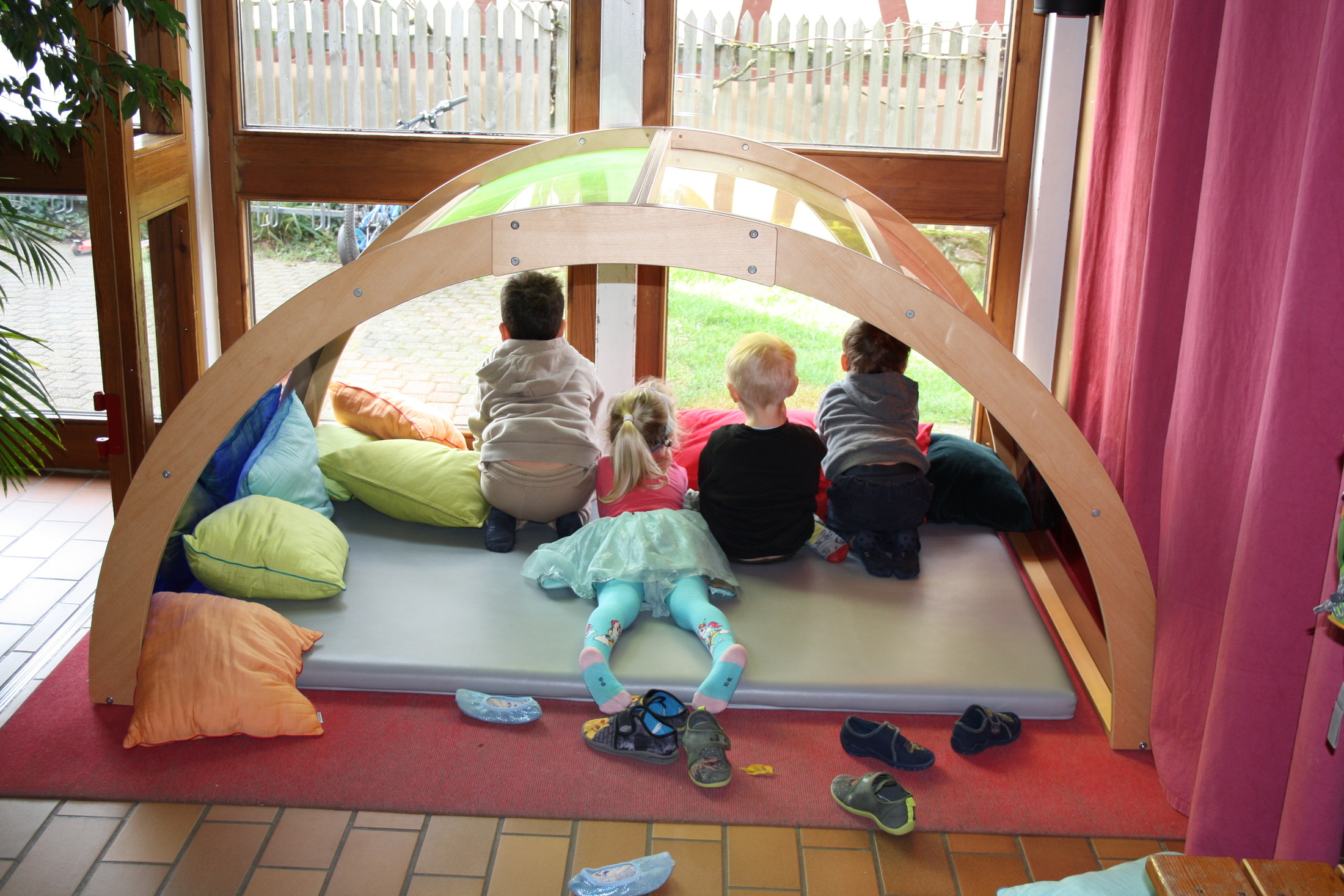 Durch unsere gruppenübergreifende Arbeit finden die Kinder Sicherheit und Geborgenheit in ihren Stammgruppen, können aber auch die anderen Gruppen und Räumlichkeiten des Kindergartens entdecken.